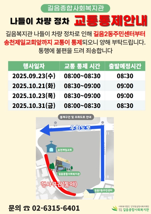 길음종합사회복지관에서 어르신 나들이 관련 차량으로 인해 복지관 앞 교통 통제가 진행될 예정입니다. (차량만 통제되며 인도는 사용 가능합니다.) 내일 9월 23일, 10월 21일, 10월 23일, 10월 31일 총 4일이며 하단에 첨부해 드린 시간 참고해 주시고, 넓은 마음으로 이해해 주시면 감사하겠습니다!
