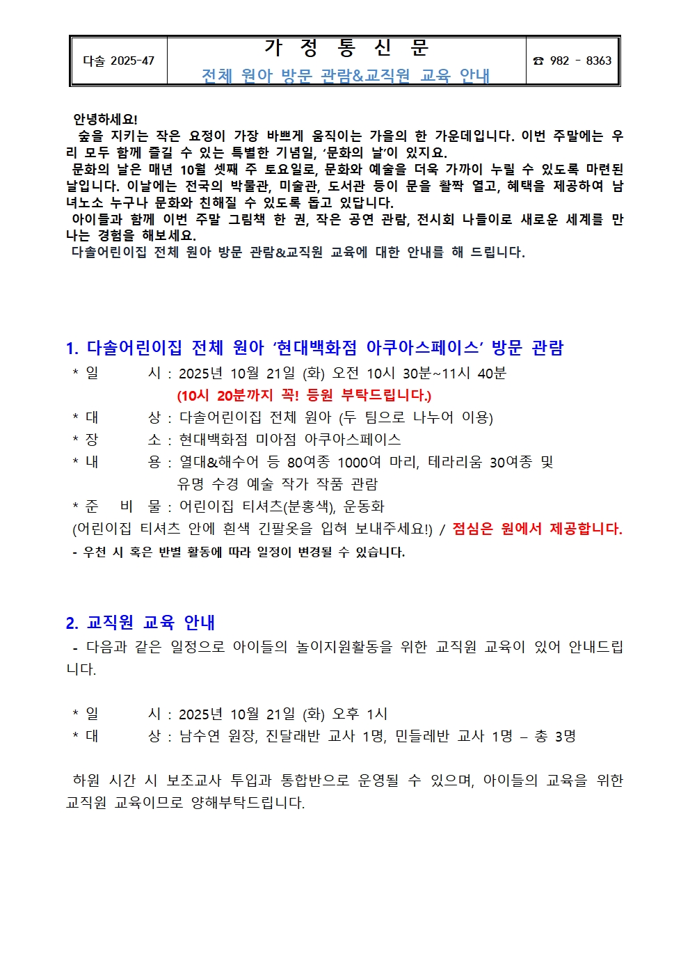 안녕하세요! 다음 주 현대백화점 아쿠아스페이스 방문 관람과 교직원 교육에 대해 안내드립니다. 자세한 내용은 첨부해 드린 가정통신문 내용 확인해 주시면 감사하겠습니다!